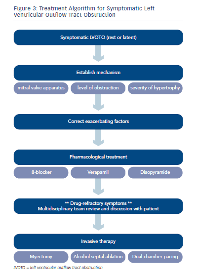 rity of obstruction; treatment is reserved for patients with LVOTO and drug-refractory symptoms.43,44 A contemporary treatment algorithm for symptomatic patients with LVOTO is summarised in Figure 3. The first-line treatment for symptoms associated with LVOTO is correction of exacerbating factors (e.g. vasodilating antihypertensives, anaemia) followed by pharmacological therapy with β-blockers, verapamil and disopyramide, which modulate the dynamic physiology of obstruction through their negative inotropic and chronotropic effects.43–46 In patients with drug-refractory symptoms or unacceptable side effects, invasive treatments should be considered by a multidisciplinary team following a comprehensive evaluation of the mechanism of obstruction: