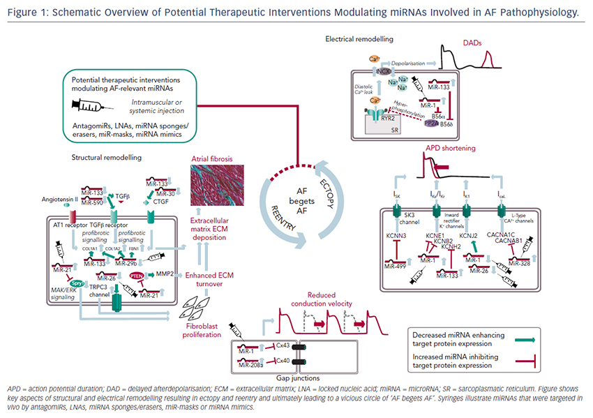 In recent years our understanding of AF pathophysiology has markedly improved by the identification of key players in cardiovascular signalling: microRNAs (miRNAs).7 We will provide a comprehensive overview of the role of miRNAs in AF and their potential therapeutic implications.
