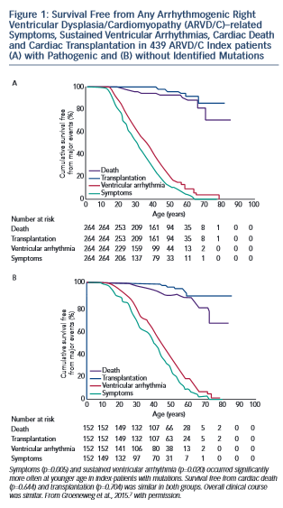 ty even within families who share both genotype and environment. However, clinically useful patterns of genotype/phenotype associations have begun to emerge. Broadly, the clinical course of ARVD/C does not differ substantially between ARVD/C index patients with and without identifiable mutations.7 As shown in Figure 1, regardless of mutation status, ARVD/C is a highly arrhythmic condition. Most index patients experience symptoms and sustained ventricular arrhythmias, but only a minority heart failure or transplant. The single exception to this pattern of overall similarity was that index patients with mutations had a significantly younger age of symptom onset and first ventricular arrhythmias than patients without mutations. This pattern of earlier onset is commonly seen when comparing strongly genetic forms of diseases with those with complex multifactorial inheritance.