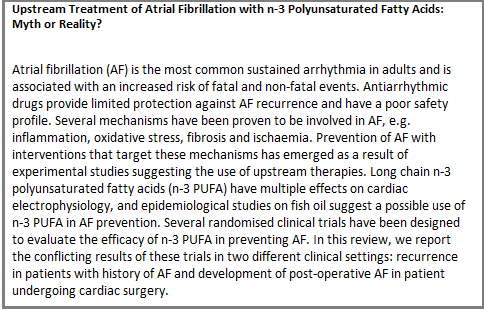 Sorice and colleagues randomised 201 patients undergoing CABG to n-3 PUFA 2 g/day or placebo for at least 5 days before surgery and until hospital discharge. The authors found a significant reduction in the incidence of POAF in the n-3 PUFA group. Interestingly, subgroup analysis showed a significant reduction of POAF only in the group including patients treated with n-3 PUFA undergoing ‘on-pump’ CABG surgery, with no effect on those who underwent ‘off-pump’ cardiac surgery. Notably, therapy with n-3 PUFA had no effect on length of post-operative hospital stay.43