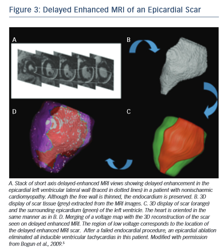 cessing of the images can be used to integrate the endocardial, epicardial and scar contours in 3D reconstruction images. There is a high degree of correlation between electroanatomical voltage mapping and the scar as characterised by MRI (Figure 3).6 Intraprocedural registration of the scar into the electroanatomic map helps to focus on an area of interest and facilitates the ablation procedure.29 The location of scar tissue has been correlated with the location of the arrhythmogenic substrate.5 A recent study demonstrated that preprocedural MRIs in patients with failed VT ablations also helped to localise the arrhythmogenic tissue and thereby indicated the likelihood of whether an epicardial ablation was necessary.30 In this study, patients with cardiac implanted electronic devices (CIEDs) were included. With appropriate precautions and device programming no adverse events were noted in the patients with CIEDs. Artefact production by the ICD generator is a limitation of MRI, as it can obscure parts of the heart, and scarring cannot be excluded with certainty if this is the case. Reduction of artefact, however, has been described using a novel wideband late gadolinium enhancement imaging protocol.31 Although MRIs have been described to be safe in patients with CIEDs32–34 it needs to be pointed out that such an approach is not yet standard of care in most institutions. Most patients with structural heart disease and VT will already have a CIED in place and therefore imaging of these patients might be more difficult depending on institutional practices and protocols. To safely perform imaging in these patients, a protocol detailing specific programming steps of the CIED prior and after the MRI and monitoring of the patient throughout the MRI in addition to specific exclusion criteria are necessary.
