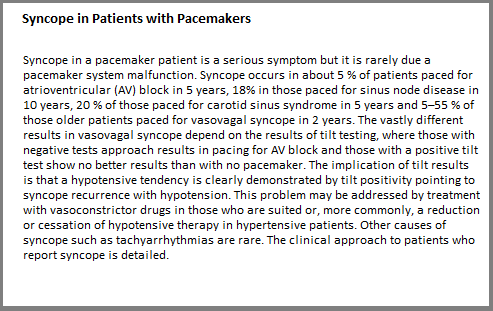 However, by 1991, Pavlovic et al., in a detailed analysis of 46 VVI- paced patients with recurrent syncope, found only two with exit block and an additional patient with sensing failure, which was unlikely to have been the cause of syncope.3 Thus, 4.3 % had pacing failure as the cause of syncope, while at the same time 8.6 % had orthostatic hypotension and 36.9 % were tilt positive. These tilt findings were invoked as explaining the syncope sustained by these patients but no explanation was found in another 30.4 %. They concluded that reflex syncope may be the most common cause of recurrent syncope in paced patients, with pacing hardware failure being quite rare.