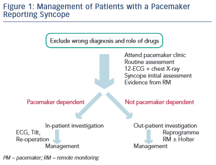 Patients paced for AVB presenting syncope represent the most likely to have a pacing hardware fault as they are likely to be pacemaker dependent. First, it is necessary to make sure that the device is appropriate for the implanting indication and then consider the possibility of a technical fault. Always, it must be borne in mind that such faults may be difficult to identify in the clinic. In this instance, telemonitoring is much more effective.1