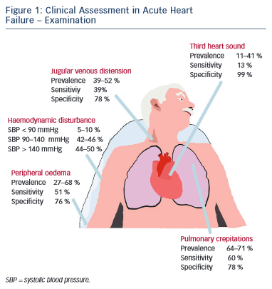 Measurement of the jugular venous pressure has been an integral part of bedside cardiology since its inception. In expert hands the value of jugular venous distension as an indicator of elevated right atrial pressure and its correlation with raised pulmonary capillary wedge pressure has been elegantly demonstrated in advanced chronic HF with excellent specificity.31,32 Yet even in this context the practical utility of this sign has not been universal, while in undifferentiated patients with acute dyspnoea sensitivity falls to as low as 39 %, perhaps reflecting in part a more general lack of confidence among the newer generation of clinicians in eliciting such signs.33–36 Similarly the third heart sound, a low pitched sound best heard over the left ventricular apex in conjunction with the rapid filing phase of ventricular diastole demonstrated excellent specificity and was an independent predictor of mortality in a large cohort of AHF patients in Japan.37 However, a lack of familiarity in the detection of this sign and poor inter-observer variability has been documented elsewhere, reflected in its low sensitivity (13–40 %) in patients with AHF presenting to the emergency department, even when augmented by acoustic cardiography (computerised measurement of the heart sounds with a synchronous electrocardiogram [ECG] trace using specialised electrodes placed at V3–V4).34,38–40