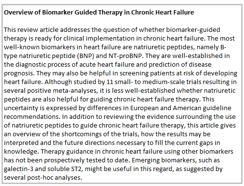 Although the first study on biomarker-guided therapy of chronic heart failure (HF) was published 15 years ago,1 there is still no real proof of the superiority of this approach as compared with standard therapy. The guidelines of the European Society of Cardiology simply state that: “several RCTs that evaluated natriuretic peptide-guided treatment (intensifying treatment in order to lower peptide levels) have given conflicting results. It is uncertain whether outcome is better using this approach than by simply optimising treatment according to guidelines”. Apart from being markers of function of different organs, biomarkers, mainly natriuretic peptides, are considered useful only for excluding HF and as prognostic markers.2 However, several metaanalyses,3–6 including a very recent one based on individual patientdata (IPD),7 have found that natriuretic peptide-guided therapy may reduce both mortality and HF related hospitalisations. However, one recent systematic review was less positive and concluded that current evidence does not support the use of B-type naturiuretic peptide (BNP) and N-terminal pro (NT-pro)BNP. to guide HF therapy.8 This review addresses current evidence of natriuretic peptide-guided therapy and discusses potential reasons why this approach needs further investigation. Moreover, it will give short insight into other emerging biomarkers that are promising for therapy guidance in chronic HF.
