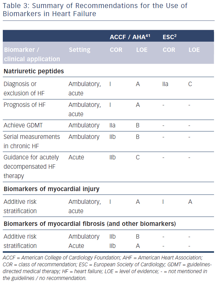 The clinical use of biomarkers in heart failure is summarised in Table 3. Natriuretic peptides, namely BNP and NT-proBNP, are wellestablished for diagnostic process of heart failure and prediction of disease prognosis, both acutely and chronically. They may also be helpful in screening patients at risk for heart failure. Importantly, natriuretic peptides may help to guide chronic heart failure therapy, but guidelines in Europe2 and the USA41 do not agree on the potential clinical implementation of such an approach. Many other biomarkers have shown to be of prognostic value, but it is not clear, apart from markers of myocardial injury in the acute setting, how this could translate into improved clinical decision making.59