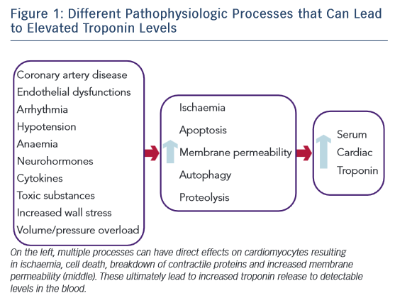The exact mechanism for increased cTn levels in acute and chronic heart failure is unknown, but many mechanisms are believed to play a role (Figure 1).9 ACS is always a consideration and a Type I MI should be evaluated for in a patient presenting with AHF.3,9 Another possibility is a Type II MI from supply–demand mismatch. This can occur in patients both with and without ischaemic cardiomyopathy. While the primary mechanism is believed to be subendocardial ischaemia, other potential drivers could contribute, including elevated filling pressures, increased wall stress, endothelial dysfunction, tachycardia, arrhythmias, anaemia, and hypotension.5,9 Increased cardiomyocyte stretch and plasma membrane permeability can lead to release of cTn from the cytosolic pool.10,11 In addition, increased wall stress can lead to cardiomyocyte apoptosis, autophagy, and breakdown of the contractile apparatus releasing cTn.12,13 Inflammatory cytokines and neurohormones may be directly toxic to cardiomyocytes as proposed in stress-induced cardiomyopathy.14 Toxic substances such as alcohol, cocaine, methamphetamine or chemotherapy may lead to cTn release by various mechanisms. The exact mechanisms leading to cTn elevation in AHF are unknown, but multiple process including both ischaemic and non-ischaemic mechanisms may contribute.