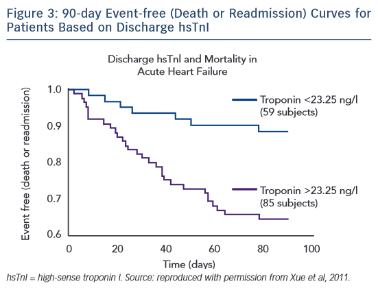 treatment had a higher mortality rate than those with a stable or decreasing hsTnI level. Patients with a discharge hsTnI level >23.25 ng/l had an increased risk of readmission and mortality (Figure 3). In an analysis of the ASCENDHF trial, an hsTnI level >0.034 ng/ml on admission was associated with an increased risk of in-hospital mortality, worsening heart failure during admission, and increased length of hospital stay in the first 7 days, but not long-term outcomes at 30 or 180 days.36 A subset of patients had hsTnI measurements taken on admission and 48–72 hours later. Patients with a 20 % increase in hsTnI level had increased risk of 30-day mortality and in a logistic regression model the hsTnI value at 48–72 hours was associated with 30-day mortality, but not the value at admission.