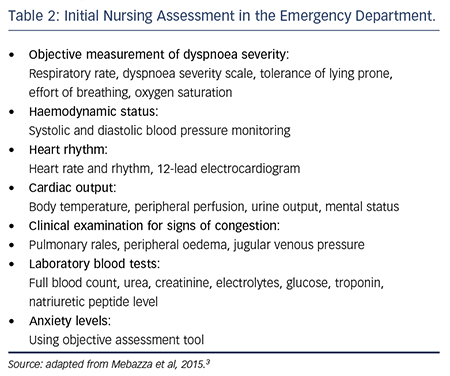 Key issues in the nurse’s initial clinical assessment of suspected acute heart failure are summarised in Table 2 and adapted from the most recent recommendations on management.3 Nurse practitioners generally have an ‘expanded’ skill set that enables them to also perform clinical examination to identify signs of congestion and refer for chest X-ray. Identifying clinical stability is an important first step in triage and enables the prompt transfer of the patient to the appropriate level of care for safe and effective therapy. This is largely influenced by the local organisation of services and skill sets of ward nurses. However, a patient at high risk of clinical deterioration or one requiring invasive cardiopulmonary support should ideally be transferred to the emergency resuscitation area, or an intensive or coronary care unit offering a lower patient-to-nurse ratio, closer patient monitoring and medical staff more available to support decision making.