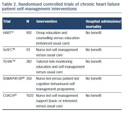 Specialist programmes were introduced to address the individual and complex care requirements in CHF and to encourage patient self- management. The HART trial17 targeted patient capacity and willingness to self-care through group education and counselling to optimise “self-monitoring, environmental restructuring, elicitation of support from family and friends, cognitive restructuring and the relaxation response” (p. 1333). A total of 902 CHF patients were randomised to an education and counselling programme or to education alone (enhanced standard care). Outcomes were assessed after 12 months; the study did not show a benefit of self-management counselling on mortality or hospital readmissions compared to education alone. Shao et al18 found that CHF patients who were randomised to a 12-week nurse-led self-management programme, which emphasised patient self-efficacy to control sodium and fluid intake (SeSFC), showed significantly better symptom control and management than usual care patients, but that both groups had similar health service utilisation. In the TEHAF study, Boyne et al19 randomised CHF patients to a tailored tele-monitoring education and self-care programme or to usual care. No significant differences in hospital admissions or length of stay in hospital were observed between groups over a 12-month period. Smeulders et al20 found that the self-care benefits of a 6-week nurse-led CHF self-management programme were no longer evident six months post-treatment compared with patients who had been randomised to usual care. The SEMAPHFOR trial21 found no difference in hospital admissions/readmissions, self-care, or quality of life between CHF patients randomised to either a nurse-led or patient-led cognitive behavioural self-management programme.