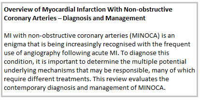 MINOCA is identified using a working diagnosis made following coronary angiography in the assessment of patients with an AMI. It is imperative that the underlying aetiology responsible for the condition is closely considered and investigated. In patients in whom no specific cause is found, further studies are warranted to assess the most effective treatment.