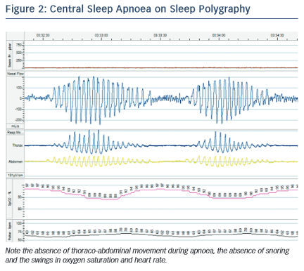 CSA is also associated with a worsened prognosis in HF. In one study, the presence of any CSA (including mild disease) was associated with a significantly shorter mean survival in patients with EF <45 %: 45 months versus 90 months.22 This has traditionally been attributed to CSA being a marker of more severe cardiac dysfunction. However, there are reasons to believe that CSA itself may accelerate HF. Patients with CSA experience episodes of hypoxaemia and swings in heart rate and blood pressure, in a similar way to OSA (see Figure 2). CSA is associated with higher sympathetic nervous system activity, known to be maladaptive in HF,23 although there is debate as to whether this is due to the CSA itself or the underlying HF.24,25 A possible role for CSA in driving enhanced sympathetic activity is suggested by the finding that administered oxygen and continuous positive airway pressure (CPAP) both ameliorate sympathetic tone.26 The episodes of hyperventilation in CSA may also increase demands on the failing heart. However, in contrast to OSA, there is no marked negative intrathoracic pressure during apnoeas and hypopnoeas, as the respiratory muscles are not stimulated, so many of the haemodynamic effects of this (such as changes in ventricular pre- and after-load) are absent.