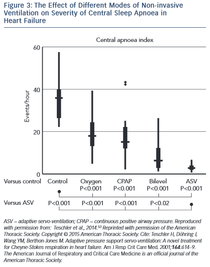 Several studies have demonstrated benefits of ASV on surrogate endpoints in CSA and HF. Teschler and colleagues showed that ASV was significantly more efficacious at suppressing CSA than CPAP, bi-level positive airway pressure (BiPAP) or oxygen therapy (see Figure 3).53 In an observational study, Oldenburg and colleagues found that 6 months of ASV therapy in those with HF and CSA almost eradicated CSA, from 37.4 ± 9.4/h to 3.9 ± 4.1/h (p=0.001) and was associated with markedly improved cardiopulmonary exercise test parameters, increased LVEF (28.2 ± 7 % to 35.2 ± 11 %; p=0.001) and reduced N-terminal of the prohormone brain natriuretic peptide (NT-proBNP) concentration.54 These results were largely replicated by Hastings et al.55 Similar improvements were found in those with HF with preserved EF (HFPEF).56 Reductions in sympathetic nervous activity have also been demonstrated with ASV therapy.57 Furthermore, registry data have revealed a significantly longer time to first implantable cardioverter defibrillator (ICD) therapy or ventricular arrhythmia in patients with HF, CSA and an ICD treated with ASV compared with those not treated58. Meta-analysis of trials suggested an overall reduction in AHI, improved exercise capacity, LVEF and quality of life measures with ASV treatment compared with controls.59 However, these trials were not powered to detect changes in harder clinical endpoints.