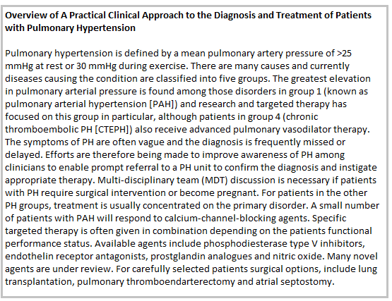 If patients have PH occurring in association with other disease processes their primary disorder should be optimised in the first instance. Strategies for the treatment of PAH vary around the world and typically advanced pulmonary vasodilator therapy is given to those patients who are in groups 1 and 4 and those who are in renal failure on dialysis. It is customary for advanced pulmonary vaso dilator therapy to be prescribed if the mPAP exceeds 25 mmHg at rest and the mean pulmonary capillary wedge pressure is less than 15 mmHg. Usually patients who receive specific targeted therapy are in World Health Organization (WHO) functional class 2, 3 or 4.1,2,4,36