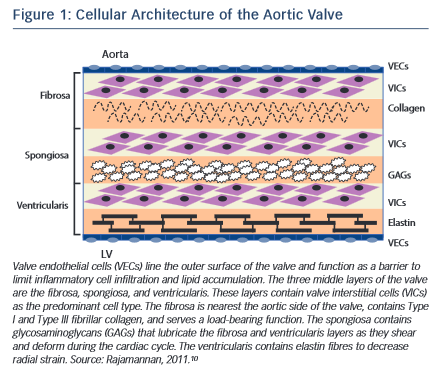 than 100,000 times a day. The healthy aortic valve comprises three leaflets and is located at the junction between the left ventricular outflow tract and the aortic root. The internal collagen framework of the leaflets is arranged in three distinct layers, which – from the aortic to ventricular surface – are the fibrosa, spongiosa, and ventricularis (see Figure 1 ). This leaflet structure is covered on both the ventricular and aortic surfaces by endothelium in continuity with both the ventricular endocardium and the aortic endothelium. Each layer of the aortic valve has a distinct structure and function. The fibrosa, with its dense connective tissue, contains circumferentially oriented collagen fibres that provide most of the strength of the leaflets. The spongiosa is found at the bases of the leaflets. It contains a loose matrix of mucopolysaccharides, and provides a cushion to resist compressive forces and facilitate movements between the fibrosa and ventricularis during leaflet motion. The ventricularis layer contains radially oriented elastin and contributes to flexibility, allowing for changes in leaflet shape during opening and closing. Under normal conditions, all three layers are avascular with no cellular infiltrates and are innervated by adrenergic and cholinergic neural networks.5–7 To remain pliable, the aortic valve must undergo continuous repair throughout life. Accumulation of fibrotic tissue and calcium in a valve leads to decreased pliability and narrowing of the valve orifice.8,9