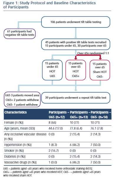 The local research ethics committee approved the study and written informed consent was obtained from all participants. All patients received normal clinical care in accordance with ESC guidelines for VVS. Subjects were divided into two cohorts: those aged >65 years (O65) and those aged <65 years (U65). The O65 group was randomised to receive either active HOT (O65+) or sham training (O65−). The U65 cohort were all actively trained and acted as an additional control group. Randomisation was performed by an independent clinician using computer-generated random numbers. Active or sham training was taught to the participant during a one-to-one training session. A written crib sheet of the training technique and regime was also provided. Participants and their clinicians not involved in the trial were blinded to the treatment group. Training was undertaken for a total of 3 months before a repeat HUTT was performed (Figure 1).