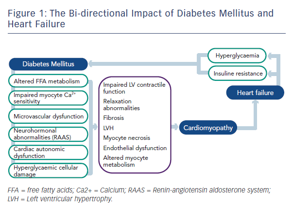 Data presented here demonstrates that these two chronic comorbid conditions cannot be thought of as two separate and distinct entities, nor can they be treated in isolation. Diabetes affects myocardial glucose metabolism, cardiac fatty acid metabolism, intra-cellular calcium cycling, accelerates coronary artery disease, contributes to microvascular dysfunction, neurohormonal upregulation and increases cardiac fibrosis.20 The combination of these pathophysiological abnormalities increases the risk for developing heart failure and place added strain on an already taxed myocardium. Patients with heart failure have altered glucose metabolism and high rates of insulin resistance, increasing the risk for the development of DM. This bi-directional impact on the other disease process inexorably links these to chronic conditions together (see Figure 1). The combination of heart failure and diabetes mellitus portends worse prognosis than either comorbidity alone.