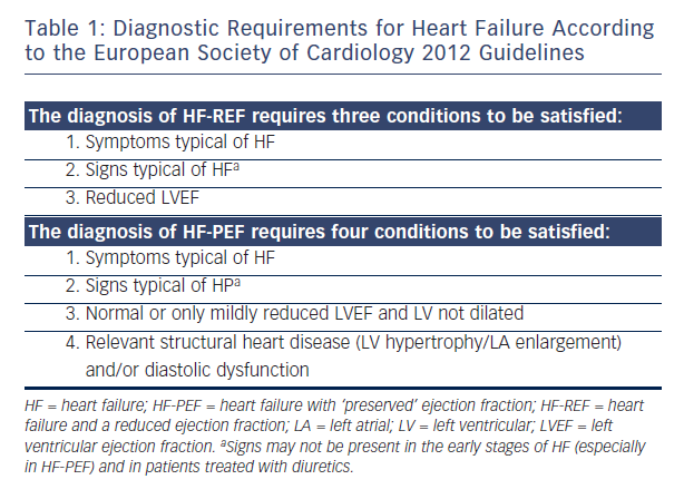 The most recent guidelines of the European Society of Cardiology1 have a simple algorithm for what is needed to guide the diagnosis of HF (see Table 1). Deceptively simple because it actually indicates two separate diagnoses to be made: HF with reduced EF (HF-REF) and HF with preserved EF (HF-PEF). Unhelpfully the table does not indicate the definition of these terms, and only in the text is it revealed that HF-REF refers to those who otherwise fit a HF diagnosis, with, in addition, a LVEF of ≤35 %. Can one assume that this value is always known; is stable and reproducible; is an equivalent between different imaging modalities and methods of calculation; or even that by exclusion that cases with a LVEF >35 % must be cases of HF-PEF as they are not by definition HF-REF? Unfortunately none of these assumptions are valid. Often the EF is not known (even more frequently in general practice) and echo-based, magnetic resonance imaging (MRI) and nuclear estimates may differ in the same patient by as much as 10 percentage points, enough to turn a case from true HF-REF into not a case. Interestingly, the HF guidelines do not actually give recommendations for the treatment of HF; mostly they give recommendations for the treatment of HF-REF and give a very much smaller list of statements about what works in HF-PEF. Brief mention is made about a third group, those with all the symptoms and signs of HF, but whose LVEF is in the range of 35–50 %. They are sometimes referred to as the ‘grey zone’, ‘HF with mild systolic dysfunction’ or HF with intermediate EF (HF-IEF). All this is a problem of our making. If we had stuck with a clinical diagnosis we would have a condition of ‘HF’, which we then would have evaluated in clinical trials. Early on we recognised that this condition presented with multiple pathophysiological and aetiological subtypes, as indeed there are for many types of cancer even of one organ. We could have described these subtypes and tested their responses to therapy separately as subgroups in a larger trial of HF. Had we done this we would have tested drugs that might work in all HF and secondarily assessed relative efficacy in major subtypes, and we then would have found that different EF ranges predicted quantitatively, but unlikely qualitatively, different responses. Had we done this we would not have two (or three) diagnoses merely one diagnosis with a pathophysiological parameter (LVEF) that is later shown to be helpful in determining different relative responses to therapy. We would not have dichotomised HF and left many of our patients understudied and undertreated. It is against this background that we review the diagnosis, epidemiology and treatment of HF-PEF. HF-PEF is what is left over when LVEFs below 50 % are excluded. It is not a positive diagnosis at all: it is one of exclusion.