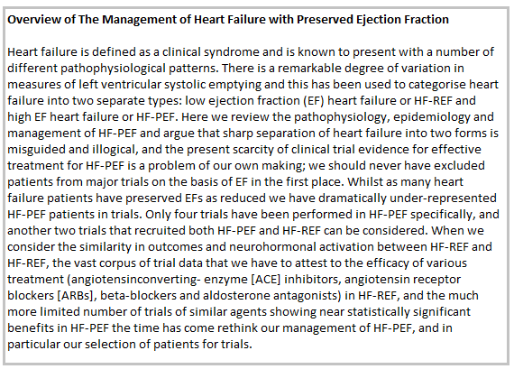 We have seen that the major trials have largely been restricted to HF-REF patients. HF-PEF trials should be able to duplicate these results. This has not happened partly because of restricted funding. Some trials (e.g. I-PRESERVE) have recruited very slowly and have been funded publically rather than by a corporate sponsor where funding is usually more generous. Consider the case of the beta-blocker carvedilol. Carvedilol is now off-patent in most developed countries so further company sponsorship of large expensive trials is unlikely. The sponsors did however pay for three trials, the US Carvedilol program,25 Copernicus and COMET.26 None of these trials included HF-PEF patients. Where resources for trials are limited it seems a tragedy that the third major trial for this agent instead of recruiting the half of all HF that had been totally ignored instead targeted a question of only marginal scientific value, whether carvedilol was superior to a non-proven formulation of another beta-blocker, non-slow-release metoprolol. We cannot, sadly, depend on sponsors studying patient populations of need, they focus where their drug will look best and avoid the more difficult or uncertain areas. If we had recruited patients with HF irrespective of LVEF in a slightly enlarged Copernicus trial and performed subanalyses of HF-PEF and HF-REF we would be in a much stronger position today. It is hard to avoid the conclusion we should investigate27–29 and treat HF-PEF as rigorously as their HF-REF counterparts.