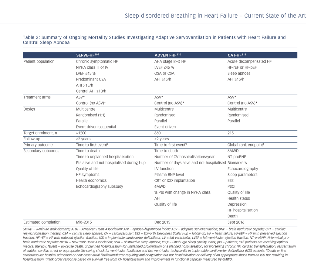 The influence of effectively treating CSA/CSR in patients with HF-rEF on objective ‘hard’ outcomes such as mortality in randomised clinical trials remains to be determined. Data from the ongoing Treatment of Predominant Central Sleep Apnoea by Adaptive Servo Ventilation in Patients With Heart Failure (SERVE-HF) (NCT00733343),109 Effect of Adaptive Servo Ventilation on Survival and Hospital Admissions in Heart Failure (ADVENT-HF) (NCT01128816)110 and Cardiovascular Improvements With MV ASV Therapy in Heart Failure (CAT-HF) (NCT01953874)111 trials (see Table 3) will help to answer these important questions.