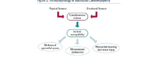 on and plaque rupture with spontaneous thrombolysis. The catecholamine hypothesis is supported by the observations that: i) plasma catecholamines levels are elevated in some patients;9 ii) pheochromocytoma associated and neurogenic cardiomyopathies produce a similar transient regional wall motion abnormality of the left ventricle in the setting of high catecholamine activity; iii) an immobilisation-induced stress rat model has been shown to elevate catecholamine levels and produce reversible ventricular ballooning; and iv) in a mouse model high levels of epinephrine has been shown to be negatively inotropic. The vascular hypothesis is supported by the frequent detection of impaired coronary microcirculatory function as well as the occasional finding of multi-vessel coronary spasm.