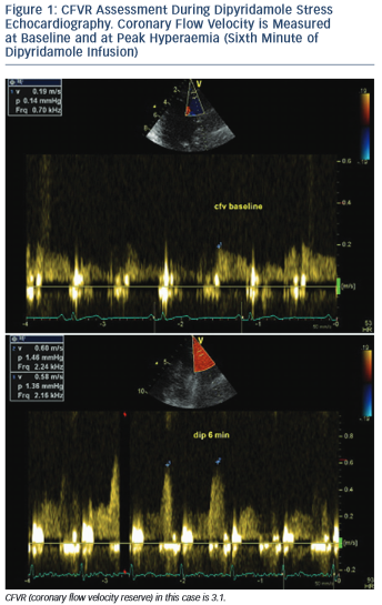Coronary flow velocity reserve (CFVR) represents the ratio between maximal (stimulated) coronary blood flow, induced by using a coronary vasodilator, and baseline (resting) blood flow (see Figure 1). As a ratio it is a dimensionless variable. It could be measured with different tools – some of them, such as intracoronary Doppler flow wire and coronary sinus thermodilution, are invasive methods and therefore associated with certain risks, radiation exposure, increased cost and ethical considerations.1 Other methods, such as cardiac magnetic resonance imaging and cardiac nuclear imaging, are non-invasive and useful for clinical research, but with limited clinical application because they are complex, time-consuming, with limited availability and expensive.2,3