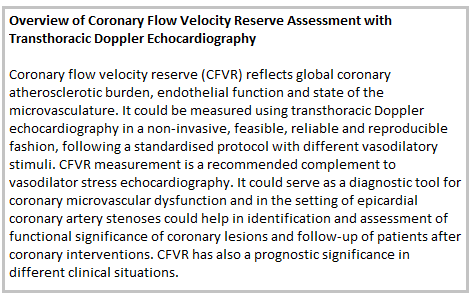 Transthoracic Doppler echocardiography is a reliable way to study CFVR with the advantage of being non-invasive, available and inexpensive. It is used to measure flow reserve in both stenosed and normal epicardial coronary arteries (every one of the three major coronary arteries can be evaluated although most of the experience is with CFVR measurement in LAD). In the presence of coronary artery stenosis CFVR is useful to detect a significant stenosis, to assess the functional significance of intermediate stenosis and to monitor for restenosis during follow-up after coronary revascularisation. In patients with anatomically normal epicardial coronary arteries impaired CFVR is a marker of microvascular dysfunction in different clinical settings.