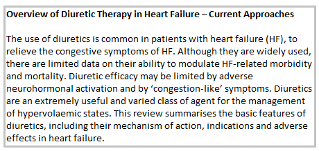 HF is the most common cause of hospitalisation in patients over the age of 65.2 The main manifestations of the syndrome are symptoms resulting from vascular congestion, such as shortness of breath, abdominal distension, oedema formation and symptoms resulting from low systemic perfusion. HF syndrome is of relevant economic importance and in the ADHERE study signs and symptoms of congestion were the most frequent cause of hospital admission.1 Congestion often develops gradually before admission and many patients may have elevated left ventricular (LV) filling pressures even when congestion (dyspnoea, jugular venous distension or oedema)3 is absent. Diuretic therapy, and especially loop diuretic therapy, are the usual way of managing congestion, especially in volume- overloaded patients.4 The most commonly used diuretics in HF are loop diuretics, thiazides and potassium-sparing diuretics.