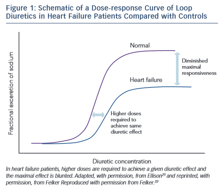 Diuretic resistance is a common problem in HF patients. Removal of excessive fluid is usually achieved by a combination of salt restriction and loop diuretics, but in some cases congestion persists despite adequate diuretic therapy. This has been termed diuretic resistance. The prevalence of diuretic resistance in the HF population is unknown due to the heterogeneity of the populations studied, the frequent comorbidity, the different treatment regimens, as well as to the different definitions used in various clinical trials. In a retrospective analysis of 1,153 patients with advanced HF, 402 patients had diuretic resistance (defined in this study as requirement of furosemide >80 mg or bumetanide >2 mg daily).20 Diuretic resistance was independently associated with total mortality, sudden death and pump failure death. Loop diuretics are ‘threshold drugs’. HF shifts the dose-response curve for loop diuretics downward and