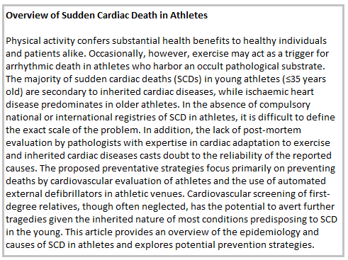 Exercise confers substantial health benefits to the vast majority of individuals but may serve as a trigger for arrhythmic death in a small minority who harbor an occult pathological substrate. Currently, PPS of young competitive athletes is recommended and supported by many societies, associations and sporting bodies around the world. Groups, arguably at greater risk of SCD, not receiving as much attention and having less access to screening include school children playing sport, senior athletes and those undertaking grassroots, amateur and recreational sports. The aspiration is that future research in this area will improve prediction tools for SCD risk in athletes and institute tailored management, including individualized exercise prescription, to prevent fatalities. However, there will always be a need to ensure that, in the event of SCA, an appropriate emergency response plan is in place and a defibrillator is readily accessible. Finally, the SCA or SCD of a young individual should instigate comprehensive evaluation of the patient and the family to ensure that relatives at potential risk are identified and treated appropriately.