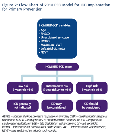 urthermore, important parameters such as LVH or LVOTO, which are contiguous variables, are treated as binary factors (present or absent). The ESC HCM outcome investigators have recently recommended a 5-year risk calculator derived from a model involving a large retrospective longitudinal multicentre experience from 3,675 patients.9,30 Eight clinical parameters were included as pre- specified predictors that were independently associated with SCD in at least one published study of multivariate survival analysis. Of the eight parameters, seven were associated with SCD or an appropriate ICD shock at the 15 % significance level and these were: age, FHSCD, maximal LV wall thickness, left atrial diameter, maximal LVOTO, NSVT and unexplained syncope (see Figure 2).