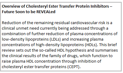The human CETP gene has been mapped to chromosome 16 on the 16q21 locus, spanning about 25 kb and consisting of 16 exons and 15 introns. The current availability of DNA arrays capable of screening the entire genome for many thousands of SNPs in large cohorts has provided a new tool for studying the aetiology of complex diseases. However, the putative instrumental variables associated with alleles and clinical outcome are not always appropriate and the method is also limited by problems associated with linkage disequilibrium. Voight and colleagues reported a large Mendelian randomisation study confirming that lower CETP activity, when associated with both lower LDL-C and higher HDL-C, is associated with cardiovascular benefit28. Studies of CETP gene polymorphisms have been controversial. The B2 allele of the Taq1B SNP of the CETP gene (which is associated with low CETP activity and raised HDL-C) was found to be accompanied by a lower than average risk of CVD29. Further analysis showed that this association was limited to one ethnic group (Chinese)30. In a 10-year follow-up study of more than 18,000 women, among 350,000 SNPs, it was found that three SNPs in or close to the CETP gene (rs708272, rs432992 and rs7202364) were associated with an increase in plasma HDL-C and a reduced incidence of myocardial infarction in this population31. Current genetic analysis indicates that a decrease in CETP activity is correlated with a decrease in CVD risk.