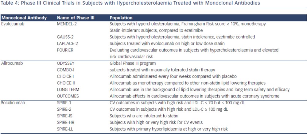 The monoclonal antibody bococizumab has undergone phase I clinical trial and shown that single and escalating intravenous and subcutaneous dose significantly lowered LDL-C by as much as 54 % with 150 mg Q2 week regimen without significant adverse effects.52 Currently, two phase III trials are underway studying bococizumab effects on cardiovascular outcomes in high risk subjects. In one of these outcomes trials, bococizumab use will be evaluated in subjects who are at high risk and have an LDL-C level of 70-100 mg/dL (SPIRE1). In another CV outcomes study, safety and efficacy of bobocizumab will be evaluated in high risk subjects who have higher than LDL 100 mg/ dL, despite high-dose statin or at the highest tolerated dose (SPIRE2) (see Table 4).