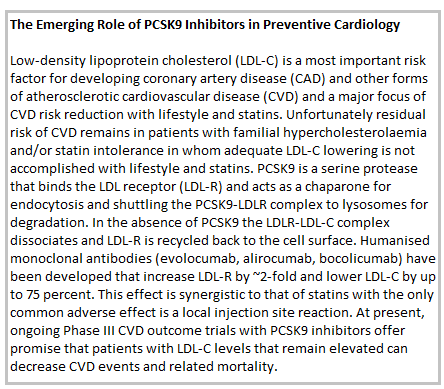 Although statins have revolutionised lipid therapy and secondary cardiovascular disease prevention, there remains a significant residual risk that can be further targeted. Certain populations may benefit from additive therapies: those with persistent elevation of LDL-C or residual risk despite optimal guideline-based therapy. Subjects with familial hypercholesterolaemia, for example, have been difficult to treat; despite maximum doses of lipid therapies, many subjects may not achieve sufficient reduction of LDL-C. Intolerance of statin, due to moderate to severe myalgias and/or a 5-fold increase in creatinine kinase have also limited the beneficial use of optimised lipid therapy, and this statin-induced myopathy may represent up to 10 % of treated patients in a primary care setting.62 At present, PCSK9 inhibitors have successfully shown to significantly reduce LDL-C, non-HDL-C and Lp(a) in different patient population and clinical settings. As we look to continued phase III clinical trials, particularly those measuring CV outcomes, PCSK9 inhibitors offer promise to patients with significant residual risk that treatment with PCSK9 inhibitors can further lower cardiovascular outcome events and related mortality.