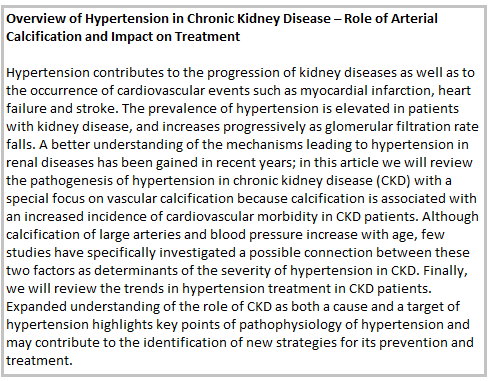 Pulse wave velocity (PWV) is the gold standard method for evaluating arterial stiffness non-invasively. It depends on the arterial wall structure and function but is mainly influenced by age-associated alterations and BP.17 Temmar et al. studied the temporal link between PWV and aortic and coronary calcifications in a cohort of 150 patients with different stages of CKD.18 They found that both vascular stiffness and vascular calcification appeared early in CKD patients. Age, mean arterial BP, diabetes and aortic calcification score were all independent determinants of increased PWV. The relationship between measures of arterial stiffness PWV and the extent of calcification in the coronary arteries was also examined by Haydar et al. in a small population of 66 haemodialysis patients.19 The mean age of the 55 patients was 56.4 years and the mean duration of dialysis was 65.4 months; they demonstrated that PWV is strongly related to the degree of EBCT-derived coronary artery calcium score in CKD patients. The next step in validating PWV as a useful tool for the risk assessment of CKD patients was to study the effect of pharmacological intervention. Clinical studies involving essential hypertension and CKD patients have shown that angiotensin-converting enzyme (ACE) inhibitors and calcium antagonists decreased aortic PWV to a large extent in response to BP lowering.20 The results indicate that independent of BP changes, survival was substantially better for those subjects whose aortic PWV decreased in response to decreased BP. Guerin et al. hypothesised that the PWV is partly dependent on BP.21 They evaluated if the changes in PWV in response to decreases in BP can predict mortality in dialysis patients. They showed that the loss of aortic PWV sensitivity to BP was predictive of adverse outcome, indicating that arterial stiffness is not only a risk factor contributing to the development of CV disease but also a marker of more advanced, less reversible arterial damage. Taken together, these results support the hypothesis that measurement of arterial parameters exploring both structural and functional properties, such as quantification of arterial calcium deposit and determination of PWV, could help in stratifying the risk but also in evaluating the risk reduction strategies by monitoring these arterial parameters under different drug regimens. Significant alterations of the aortic PWV appear at an early stage of the disease; mild-to-moderate renal insufficiency, an elevated stiffness of the central arteries seems to be significantly associated with a reduced creatinine clearance, independent of BP and other standard CV risk factors.22 These results suggest that alterations of the viscoelastic properties of the arterial wall are significantly connected to renal alterations, and that this association is present long before the appearance of ESRD and macrovascular complications.23