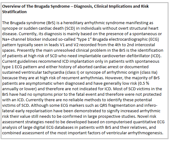 The identification of BrS patients with high arrhythmic risk especially among those without previous history of arrhythmia-related symptoms is currently the most important and yet unresolved clinical problem in the BrS. In some aspects, this problem is similar to one of the main (also still not fully resolved) problems of modern cardiology – the identification of patients with ischaemic heart disease (IHD) at high risk of dying suddenly who need prophylactic implantable cardioverter-defibrillator (ICD).