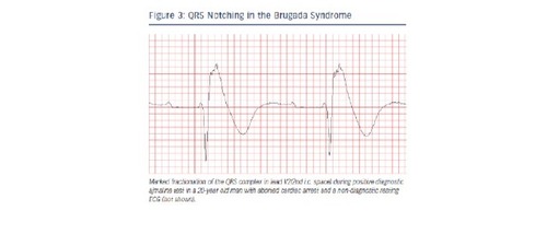 the presence of notched or fragmented QRS,31,83 (see Figure 3) has been consistently demonstrated to indicate increased arrhythmic risk independently of other clinical and ECG variables (HR 4.9, 95 % CI 1.6-15.4 in the PRogrammed ELectrical stimUlation preDictive valuE (PERLUDE) study).85