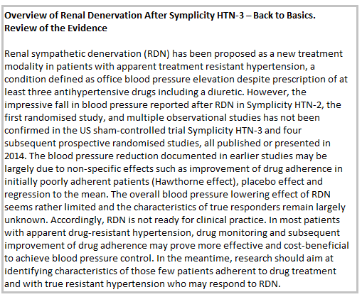 As of now, the modest overall benefits and high cost of RDN should be balanced with its potential risks. In particular, more than 20 cases of de novo renal artery stenosis have been reported after RDN,52 most of them after the announcement that Symplicity HTN-3 failed to meet its primary endpoint. RDN deserves further investigation but is not ready for clinical deployment and its use should be restricted to research protocols. Accordingly, in Germany, the insurances companies which were the first in Europe to reimburse the procedure have terminated their coverage, and even well-known proponents of the technique acknowledge that RDN “should be returned back to the academic arena”53 before further clinical deployment.