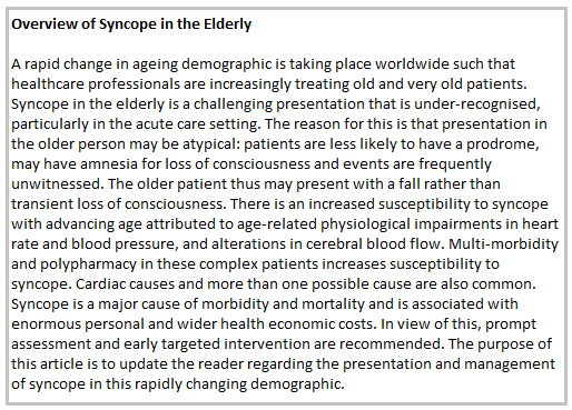 Why is syncope in the elderly important? Presentation in this age group is challenging and often recognition is the first step to optimising management and care of these patients. To start with, syncope in the older patient is under-recognised, particularly in acute care settings because the presentation is frequently atypical.