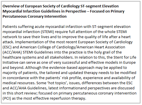 Although the evidence-based approach described in the Guidelines may be applied to the majority of STEMI patients, the tailored and updated therapy needs to be modified in concordance with the patients´ risk profile, our experience and availability of medical resources. The establishment of the STEMI network and cooperation among all stakeholders can serve as the background for further improvements and new trials focused on clinical outcomes.