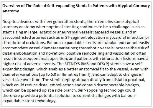 In challenging anatomy such as tapered vessels, bifurcations, left main, SVGs, CTOs, and aneurysmal or ectatic vessels, the STENTYS Self-Apposing stent could provide an alternative solution over balloon-expandable stents to achieving simplified stent sizing with improved apposition, both during the procedure and in the days following in case of positive remodelling.
