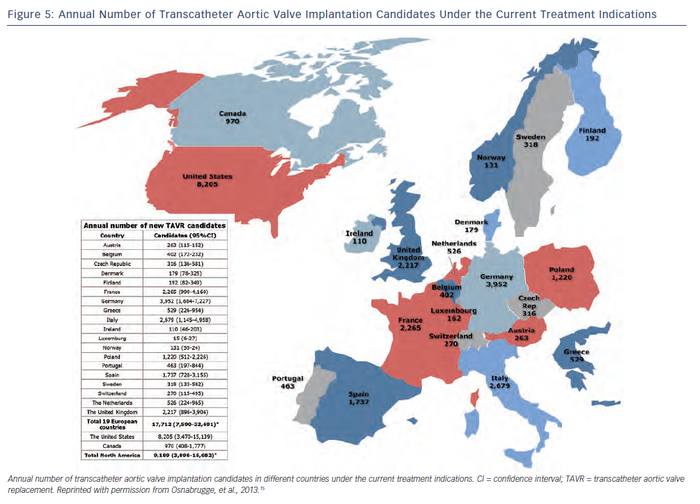 Extrapolating these data, Osnabrugge et al. estimated that there are 189,836 (95 % CI, 80,281-347,372) TAVI candidates in the Europe and 102,558 (95 % CI, 43,612-187,002) in North America. Annually, there are 17,712 (95 % CI, 7,590-32,691) new TAVI candidates in Europe and 9,189 (95 % CI, 3,898-16,682) in North America (see Figure 5). Like all meta-analyses and modelling studies, this study has limitations, such as differences in the definition of aortic stenosis used among the included studies and more importantly, the difficulty associated with determining the number of inoperable or high-risk patients that are truly suitable for TAVI.16 In the future, more comprehensive prospective national and international registries detailing the actual treatment of high-risk aortic stenosis patients (medical therapy, SAVR, TAVI) will provide invaluable insights into the management of aortic stenosis patients. In the meantime, the study by Osnabrugge et al. reflects the best available evidence detailing the prevalence of severe aortic stenosis in the elderly, and provides the only estimate of the number of potential of TAVI candidates.