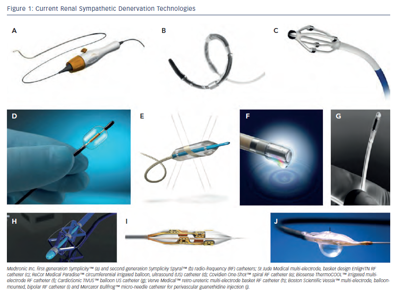 Preclinical studies have clearly demonstrated that interruption of renal SNS signalling, by either surgical ligation and re-anastomosis or chemical adventitial stripping of the renal artery, prevents the development of hypertension and, furthermore, attenuates established hypertension in numerous animal models of hypertension.21 Further evidence for benefit of renal sympathectomy in the treatment of hypertension comes from a study of patients treated with bilateral nephrectomy for end-stage chronic kidney disease (CKD) maintained on haemodialysis or post-transplantation, which demonstrates sustained BP reduction.22 While these techniques are not suitable for use in humans, the recent development of minimally invasive, catheter-based solutions10,23 to effect selective RSD has re-ignited interest in this field.