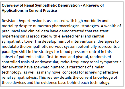 To date, the majority of clinical studies have evaluated the efficacy of RF (and non-RF) RSD in predominantly severe RHTN. However, given that the pathophysiological basis for RSD therapy is based not on BP level but on the recognition that RHTN is associated with elevated central SNS tone, RSD may be an effective treatment for other conditions that exhibit similar elevated central SNS tone, whether renally mediated or not. As such, RF RSD has been evaluated in other systemic conditions and pleiotropic effects of RF RSD have been reported in both systolic83 and diastolic84 heart failure, obstructive sleep apnoea,85 glycaemic control in RHTN patients85,86 and both supra-ventricular74 and ventricular arrhythmias.87