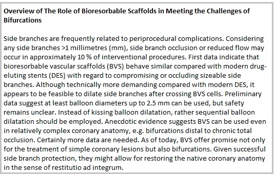 The increased adverse event rate generally observed in bifurcation lesion treatment relates to diverse mechanisms such as incomplete stent coverage of parts of the lesion, several layers of stent struts at other parts, flow-limiting struts across the side branch ostium, or incomplete stent apposition. The Absorb™ Bioresorbable Vascular Scaffold (BVS) is made of poly-L-lactide acid (PLLA), with a strut thickness of 157 micrometres (µm) constructed as in-phase hoops with straight links, eluting everolimus.11 With regard to bifurcation lesions, it may offer several advantages. In particular, there is no long-term risk of stent thrombosis related to uncovered struts. Also, it is more flexible compared with a DES. It will not straighten the vessel and thus is not expected to change the native shear stress distribution. Over the course of 12-24 months, endothelial-dependent vasomotion appears to be restored,12 potentially further reducing the risk of late adverse events. Bioresorbable struts covering the ostium of the side branch have been observed to develop into a neointimal bridge, leaving a smooth ostial contour of the side branch.13,14