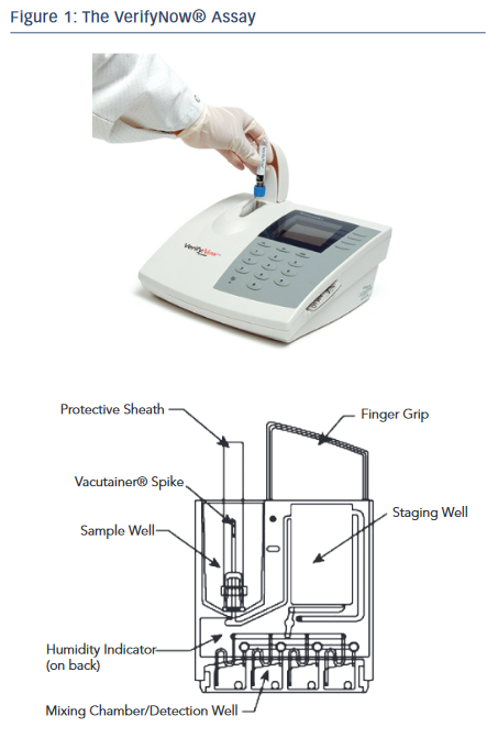The VerifyNow System (Accumetrics Inc, San Diego, CA, US) is a pointof- care assay that measures agonist-induced platelet aggregation by turbidimetric based optical detection, using a four-channel disposable cartridge (see Figure 1). In the channels, platelets are activated by the presence of agonists and bind to fibrinogen-coated beads, causing agglutinates to drop out of solution. The change in optical density is then measured.31 Results are reported as P2Y12 reaction units (PRU), a BASE (base PRU) value, and a percentage of inhibition calculated from the BASE and PRU.