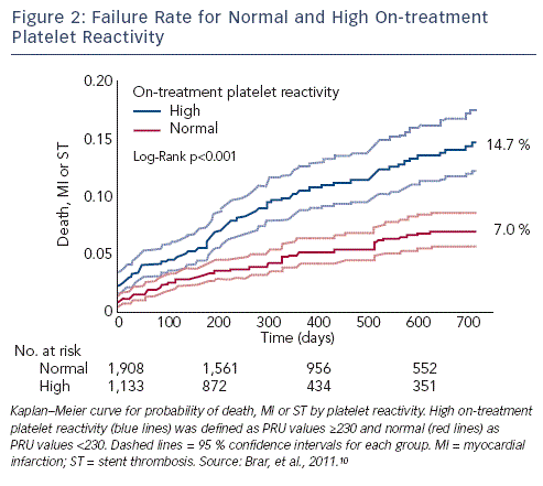 The level of platelet function inhibition as measured by a point-of-care assay is an independent predictor for the risk of major adverse cardiac events after PCI.43 A recent systematic review and meta-analysis concluded that initiating intensified antiplatelet therapy on the basis of platelet reactivity testing in patients after PCI is associated with a significant reduction in cardiovascular mortality, ST and MI (p<0.01 for all).44