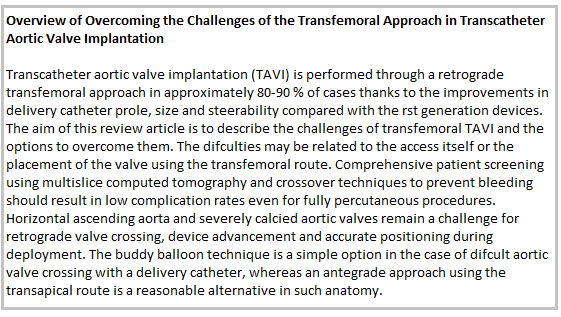 The buddy balloon technique is a simple and easy tip and trick for challenging retrograde valve crossing. Of note, the buddy wire technique was not effective in the report by Sheiban et al.,14 similarly as in our own experience. Finally, the buddy balloon technique may avoid excessive manipulations with the delivery system and wire, and potentially reduce the risk of left ventricle perforation by the wire and embolisation of calcic particles when struggling to cross the valve. Another option in such cases is to convert to transapical approach or even surgical aortic valve replacement. The former is the only TAVI approach using an antegrade crossing of the valve with the device, which is technically easier than the retrograde crossing required with all the other TAVI approaches.