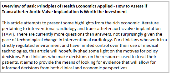 Alongside some of the above-mentioned studies, data on cost have been collected and analysed. Costing studies are generally descriptive and aim at informing about the exact cost that an innovation incurs for a specific type of payer. The latter can be a hospital, health insurance or the patient, and the results of a costing study can vary greatly depending on the perspective taken. In France, for instance, the mean initial hospital stay cost related to TAVI was €35,164 (US$40,619) to the hospital, based on the materials, human resources and overhead costs incurred by 287 patients of a national registry in 2009.14 Using a similar approach, patients in the PARTNER B cohort were reported to incur a cost of US$78,542 to the hospital in 2010.15 The authors of the French study further reportedthat since August 2012 (taking into account a decrease in hospital cost over time), the mean tariff for a TAVI hospital stay is €3,000 (US$3,500) below the cost to the hospital, which means that there is a gap between the cost incurred by the hospital and the reimbursement obtained.