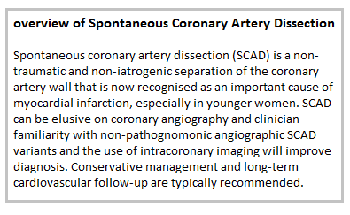 Recent series of prospectively followed SCAD patients have provided important information on acute and long-term cardiovascular outcomes. Most patients present with acute coronary syndromes with either non- ST elevation or ST-elevation MI and a small proportion have ventricular arrhythmias. Acute in-hospital mortality was relatively low (<5 %) in contemporary series. Recurrent MI or need for revascularisation in initially conservatively managed patients was 5–10 %.1,10 However, following the acute event, a significant proportion of patients have recurrent chest pains (often atypical in features). Subacute major adverse cardiovascular events (MACE) were reported at 10–20 % at 2-year follow-up, with recurrent SCAD event of ~15 %. At longer-term follow-up from retrospective cohorts, estimated rate of MACE can be up to 50–60 %.1,10 Therefore, SCAD survivors should be closely followed by cardiovascular specialists.